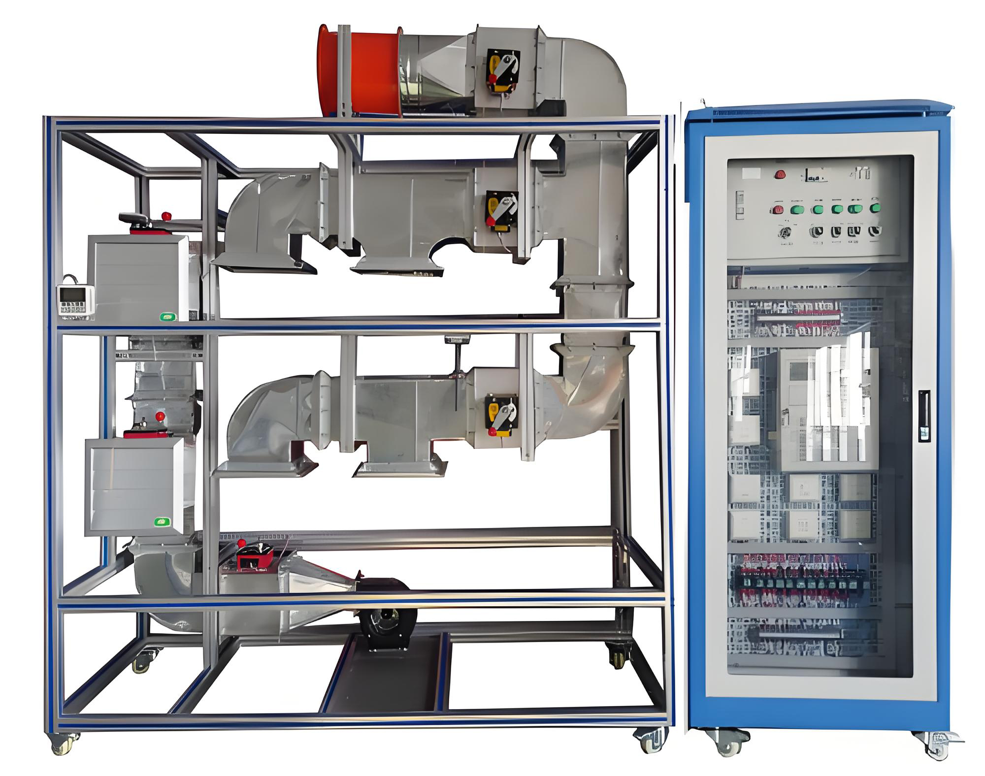 1、風(fēng)系統(tǒng)整體放置在一個(gè)2000mm×1000mm×800mm平臺(tái)上,可移動(dòng),平臺(tái)上風(fēng)系統(tǒng)由不燃材料制作,系統(tǒng)中設(shè)置有閥門,風(fēng)機(jī),子系統(tǒng),出風(fēng)口等。